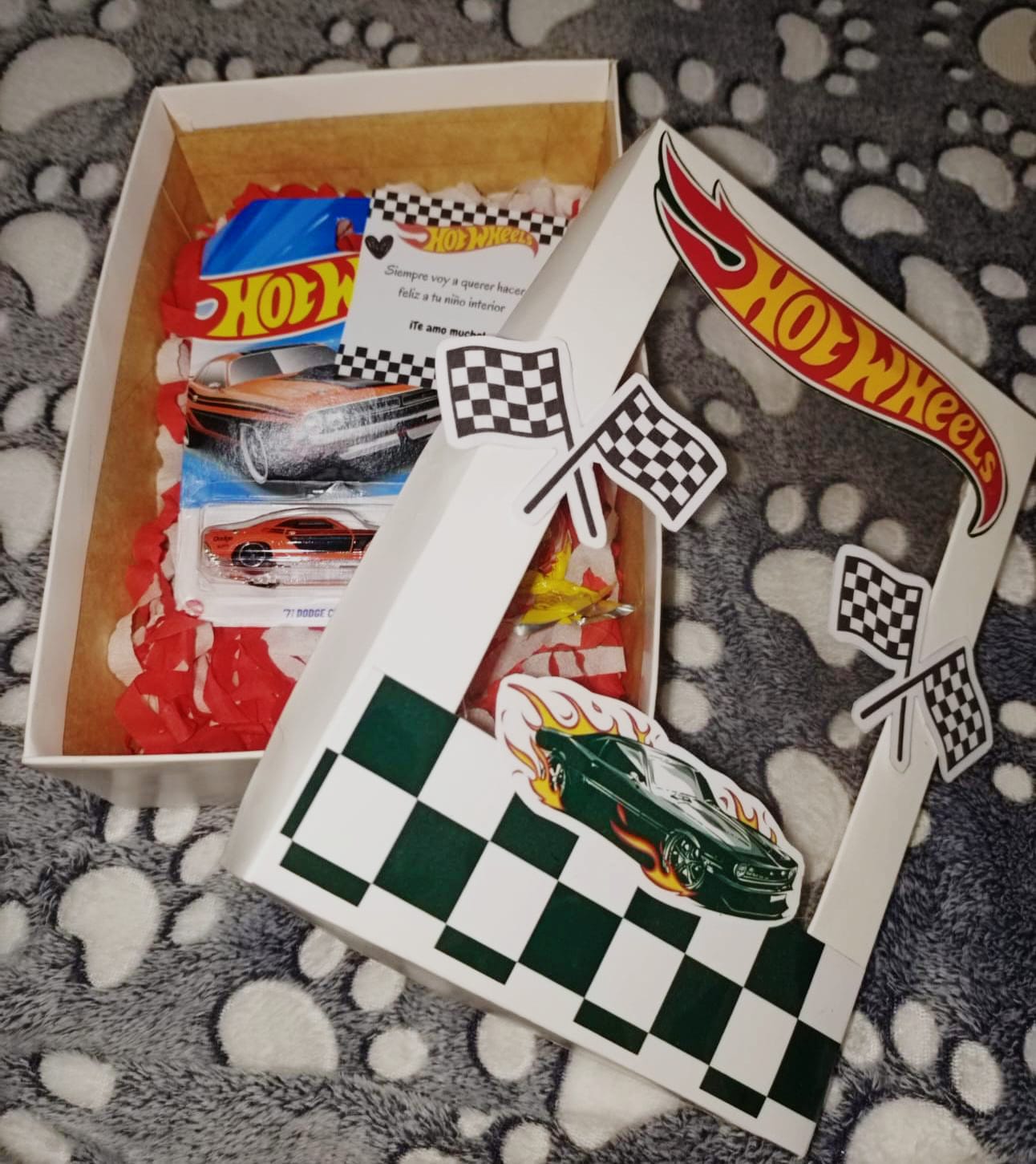 Caja regalo temática Hot Wheels con autos coleccionables, decoración premium y diseño inspirado en las pistas de carreras. ¡Un detalle lleno de velocidad y estilo!