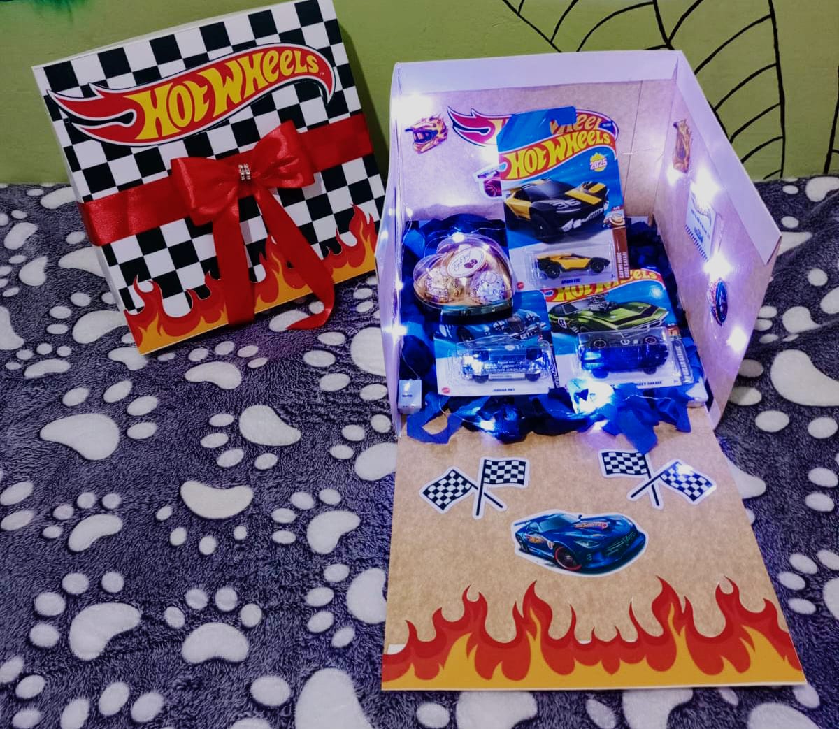 Caja romántica Hot Wheels con dulces, fotos y luces LED. El regalo ideal para tu copiloto en la vida.