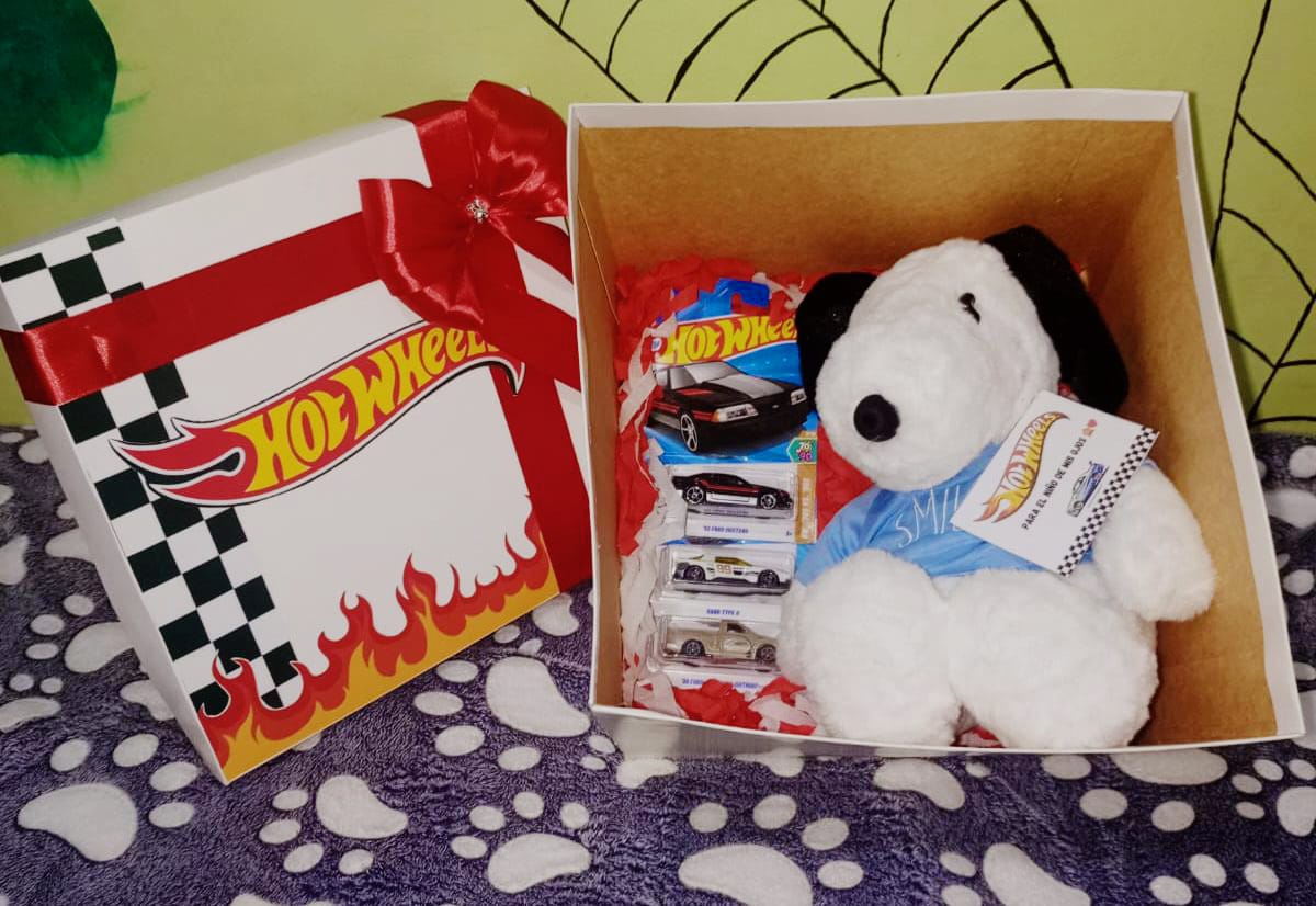 Caja regalo Hot Wheels edición premium con autos coleccionables y peluche Snoopy. Diseño exclusivo y presentación lista para obsequiar.