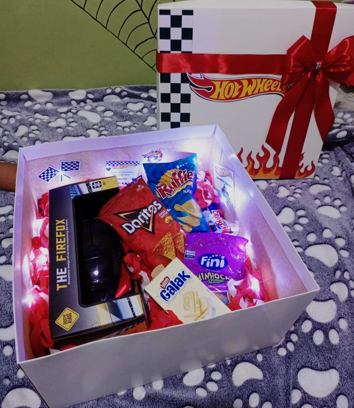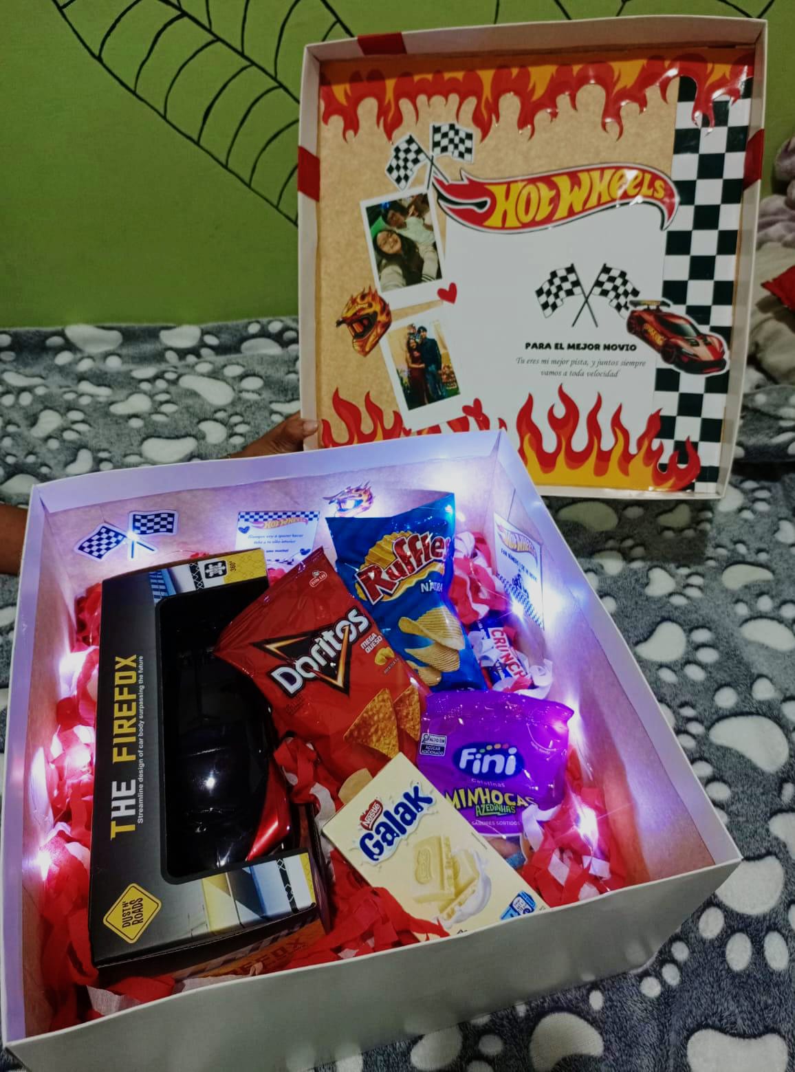 Caja Hot Wheels con luces LED, autos coleccionables y dulces. Un detalle original que brilla con estilo.